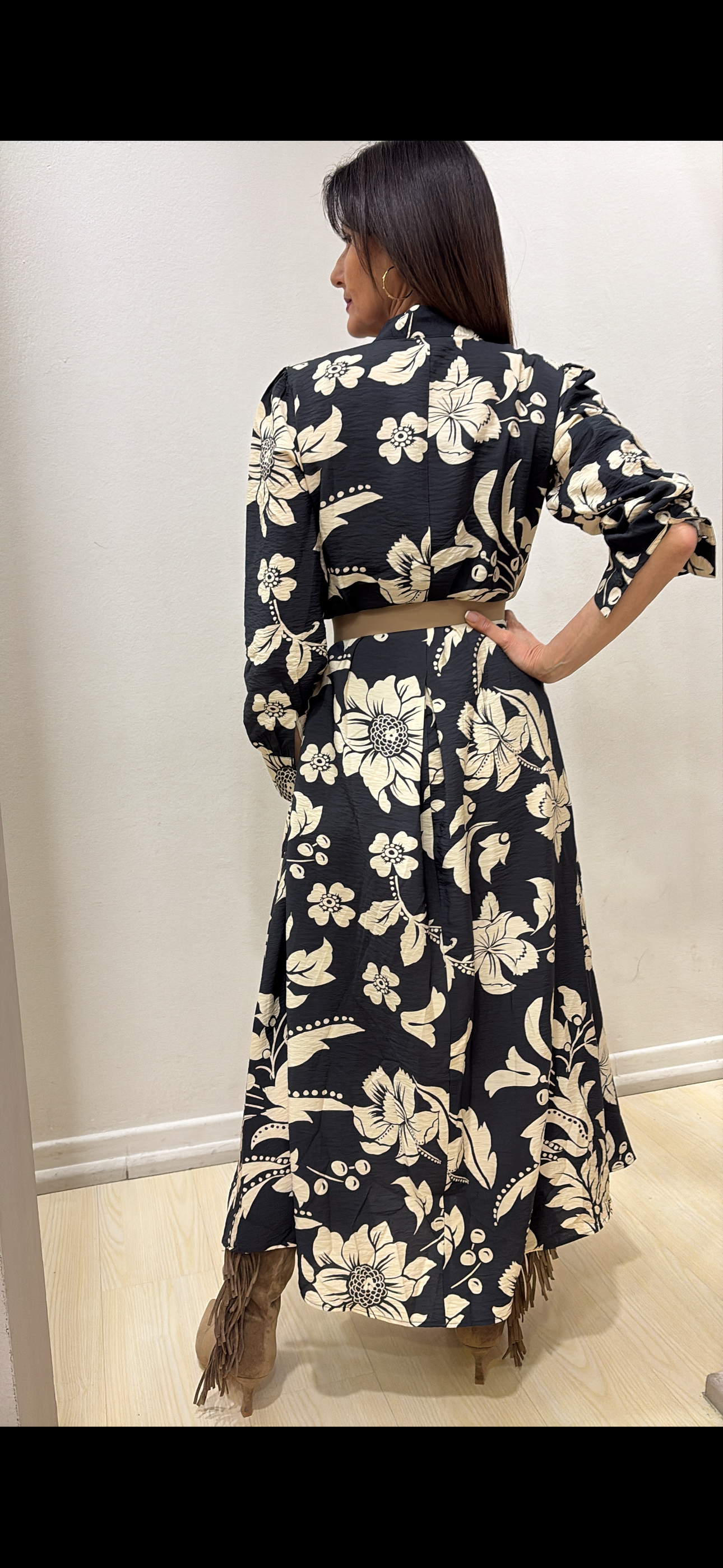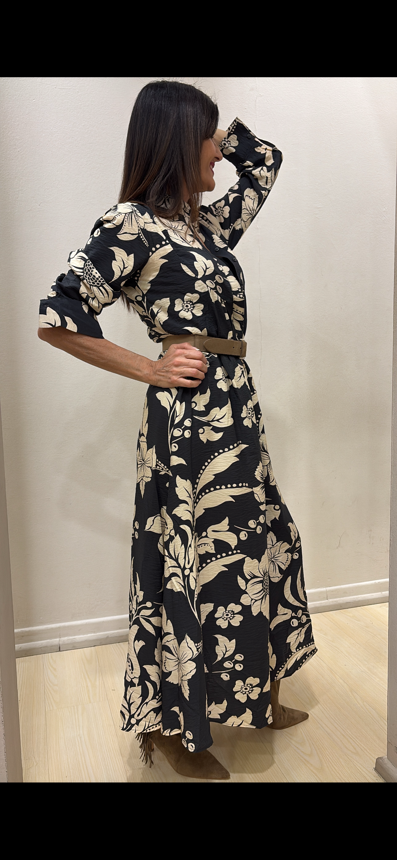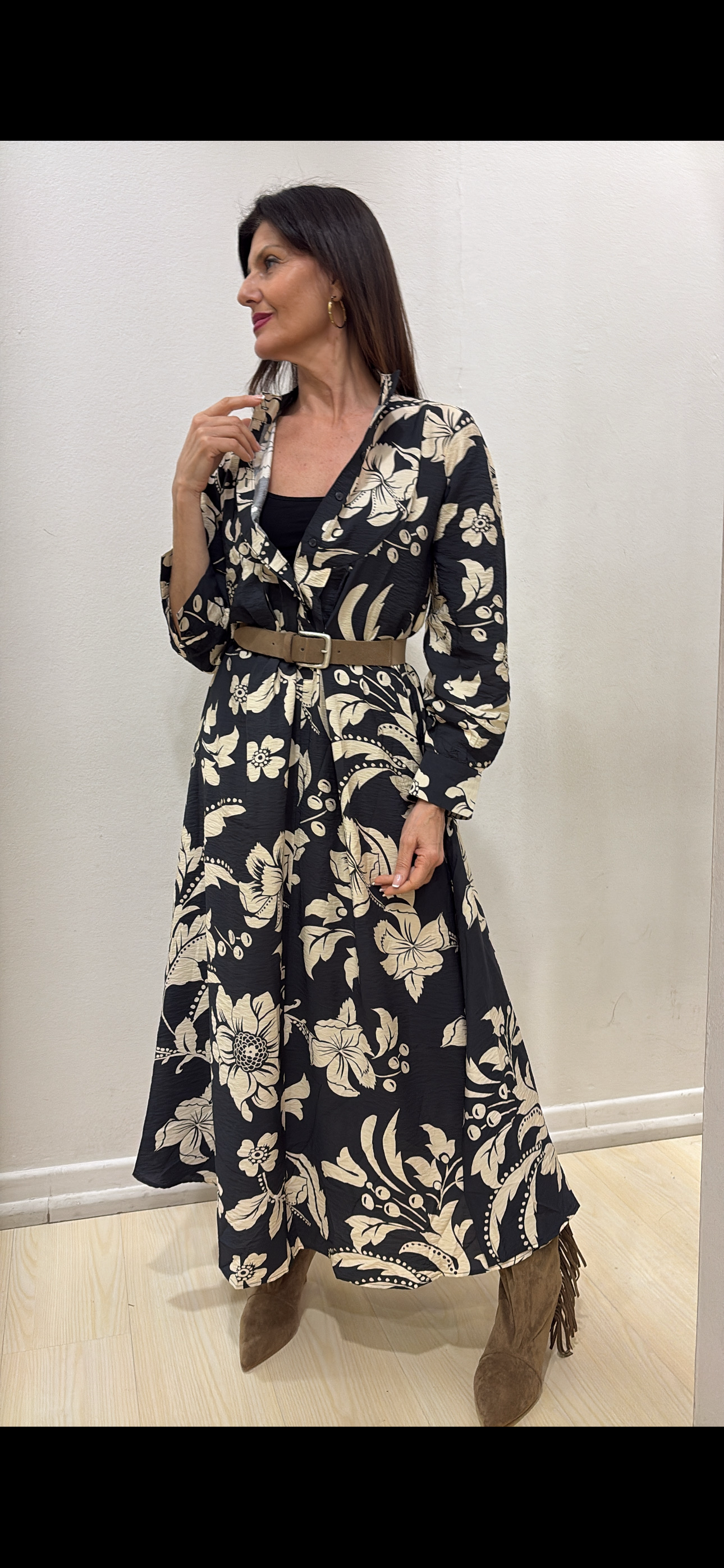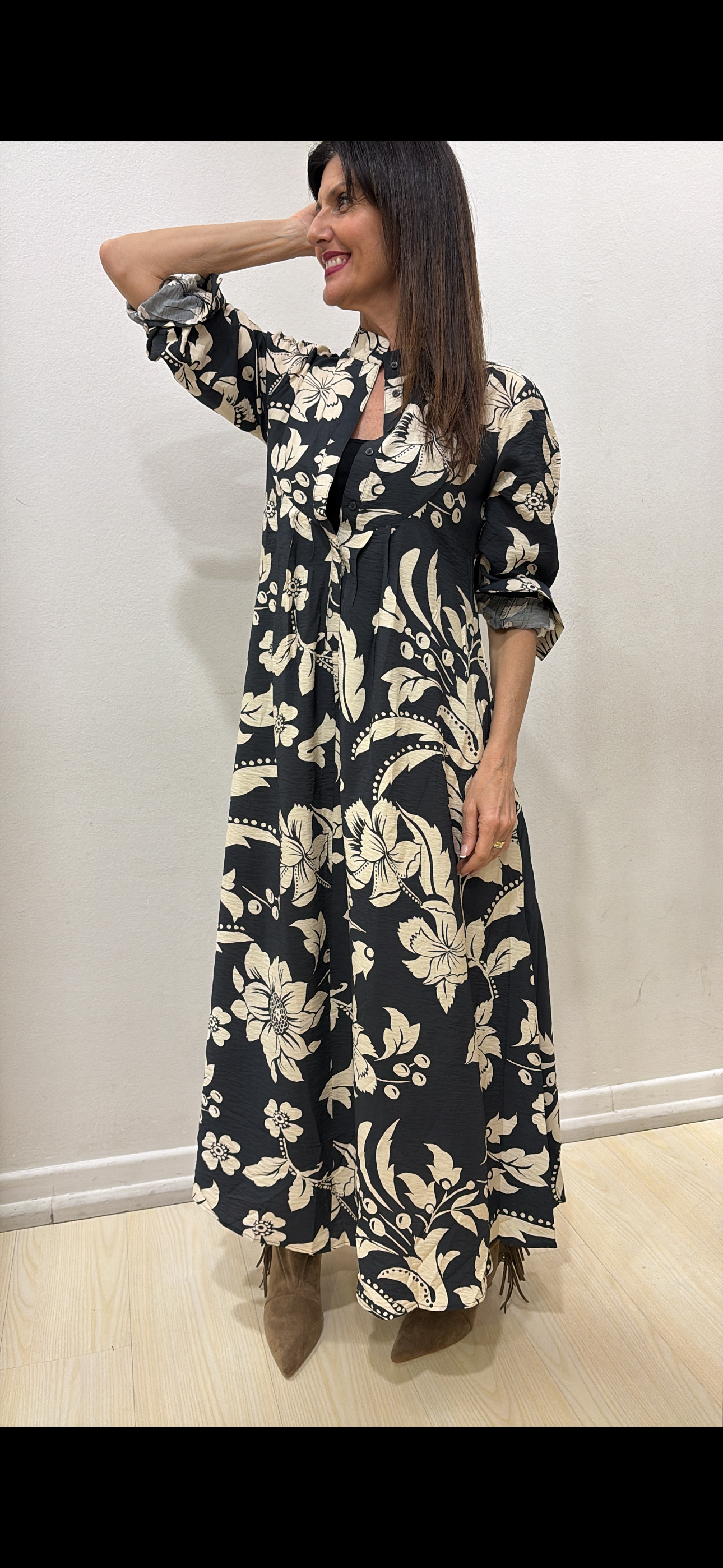 Abito lungo in misto viscosa, leggero e fluido, caratterizzato da una fantasia su base nera con delicati fiori color panna. Il modello presenta un elegante collo alla coreana con abbottonatura frontale fino alla vita. Sul davanti, un motivo sagomato e stondato crea un raffinato gioco di linee che valorizza la silhouette, mentre la gonna scende morbida e svasata.