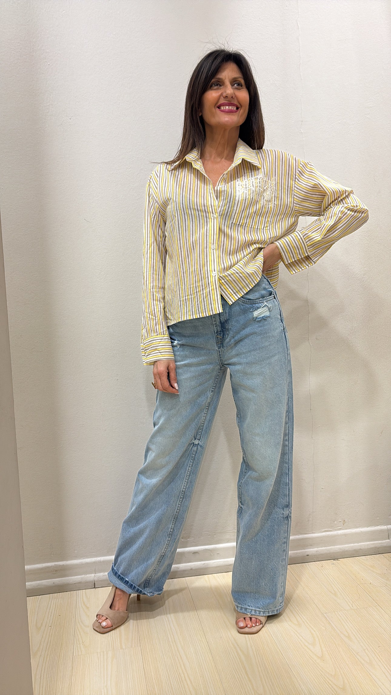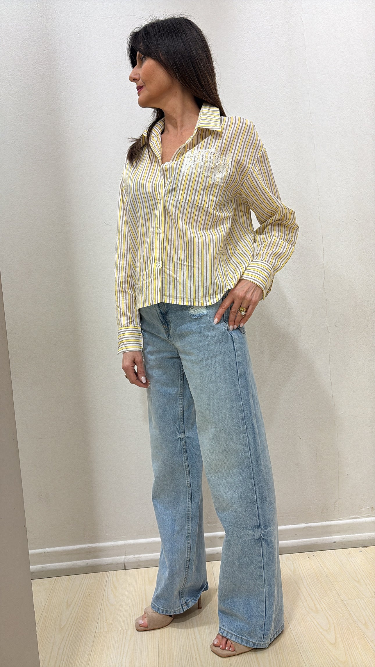 Camicia a variante unica in tonalità gialla con gessatura panna e beige, dal design fresco e originale. Il modello “scatoletta”, senza pinces, presenta una linea morbida e pulita che cade dritta sul corpo. La lunghezza è leggermente corta, ma studiata per poter essere facilmente infilata nel pantalone. Il taschino sul davanti aggiunge un dettaglio delicato, impreziosito nella parte superiore da una raffinata rifinitura in pizzo panna. Un capo femminile e versatile, perfetto per look quotidiani con un tocco di eleganza.