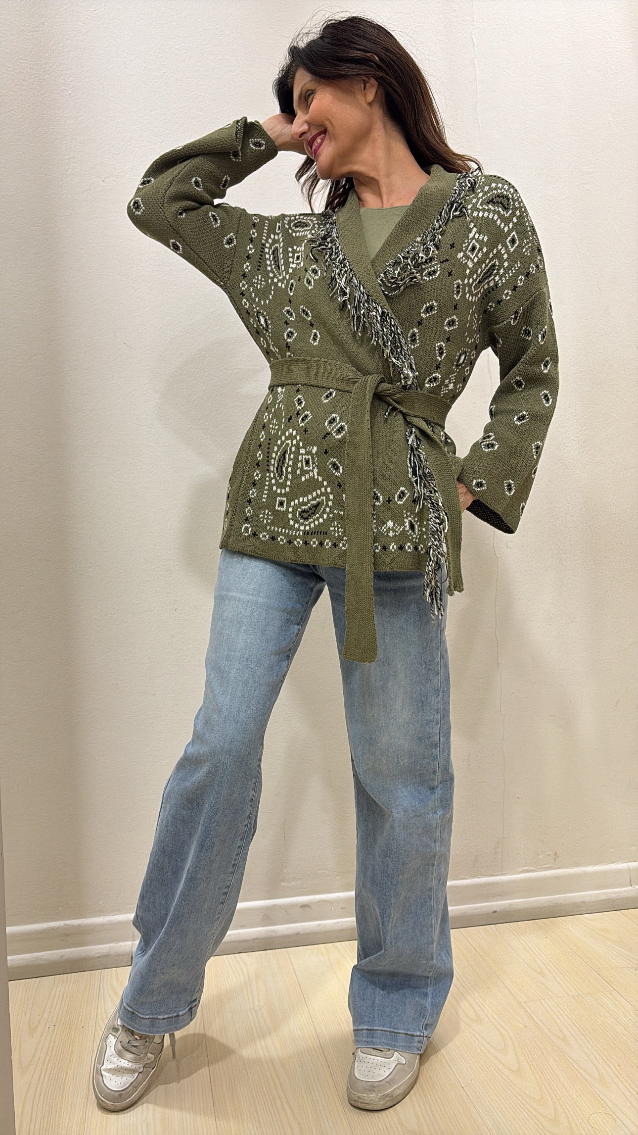 Cardigan in maglia dal fascino ricercato, caratterizzato da un’elegante fantasia cachemire che dona movimento e personalità al capo. Il collo sciallato avvolgente è impreziosito da frange decorative che ne contornano il profilo e scendono lungo tutto il bordo fino al fondo del cardigan, creando un effetto dinamico e raffinato.