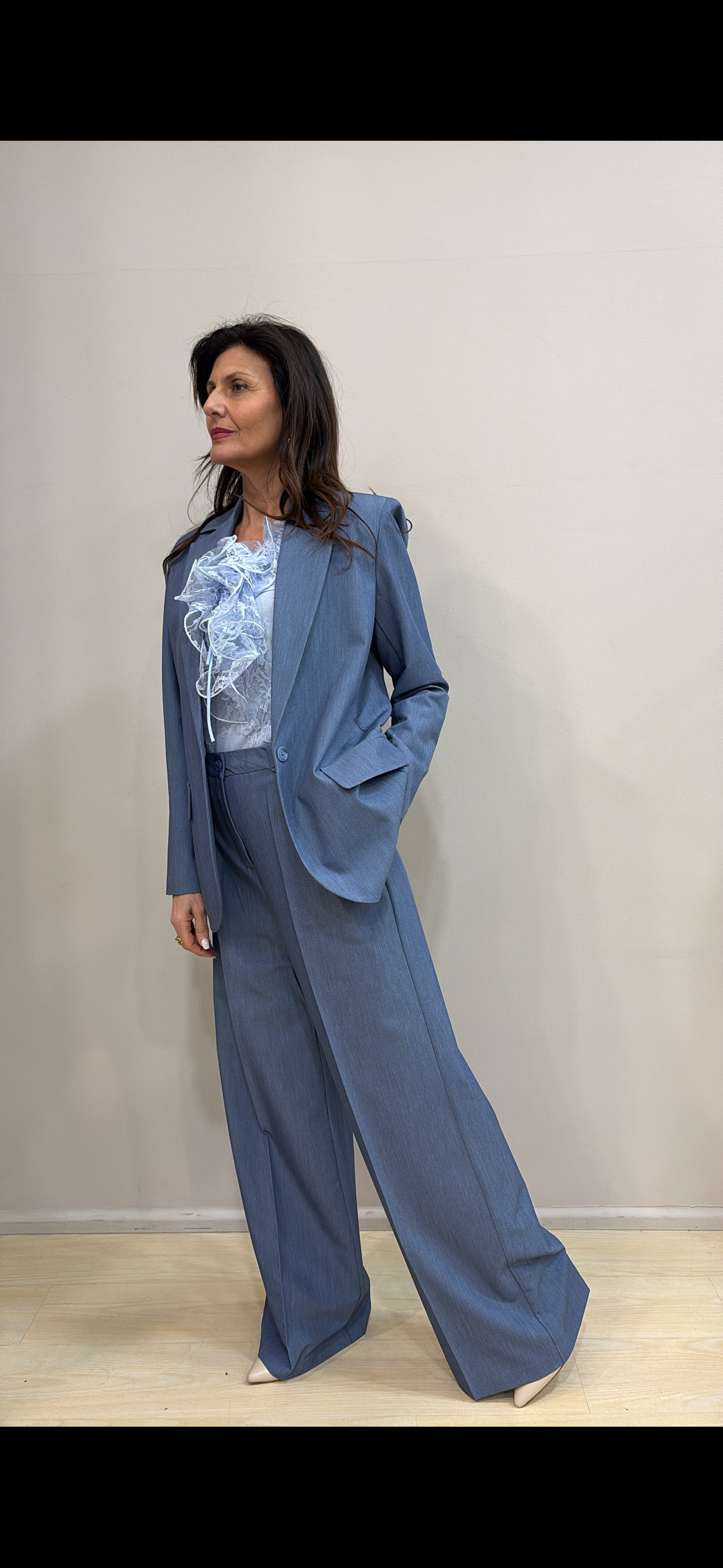 Un completo versatile e raffinato, perfetto sia per l’ufficio che per occasioni più formali, da indossare con sneakers per un look moderno o con tacchi per un’eleganza più decisa.