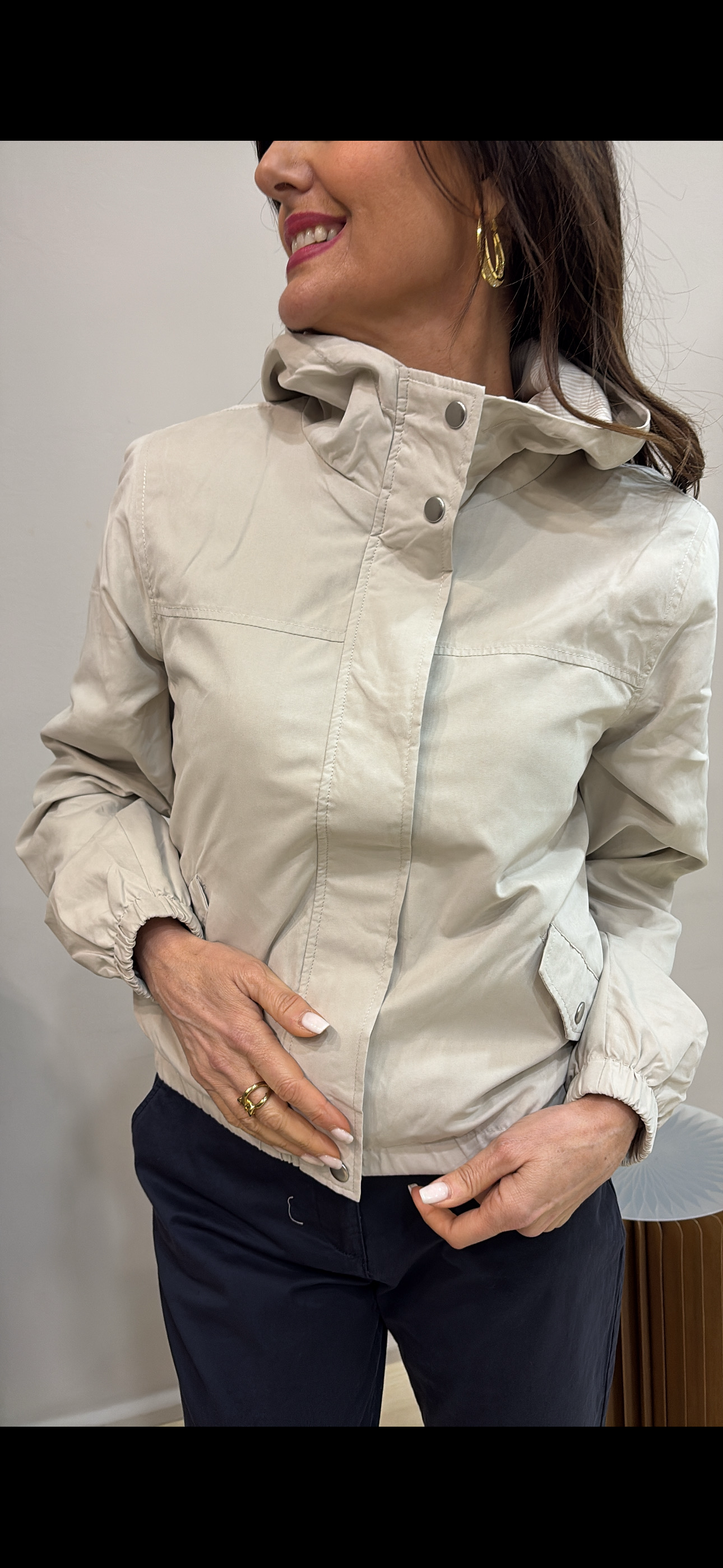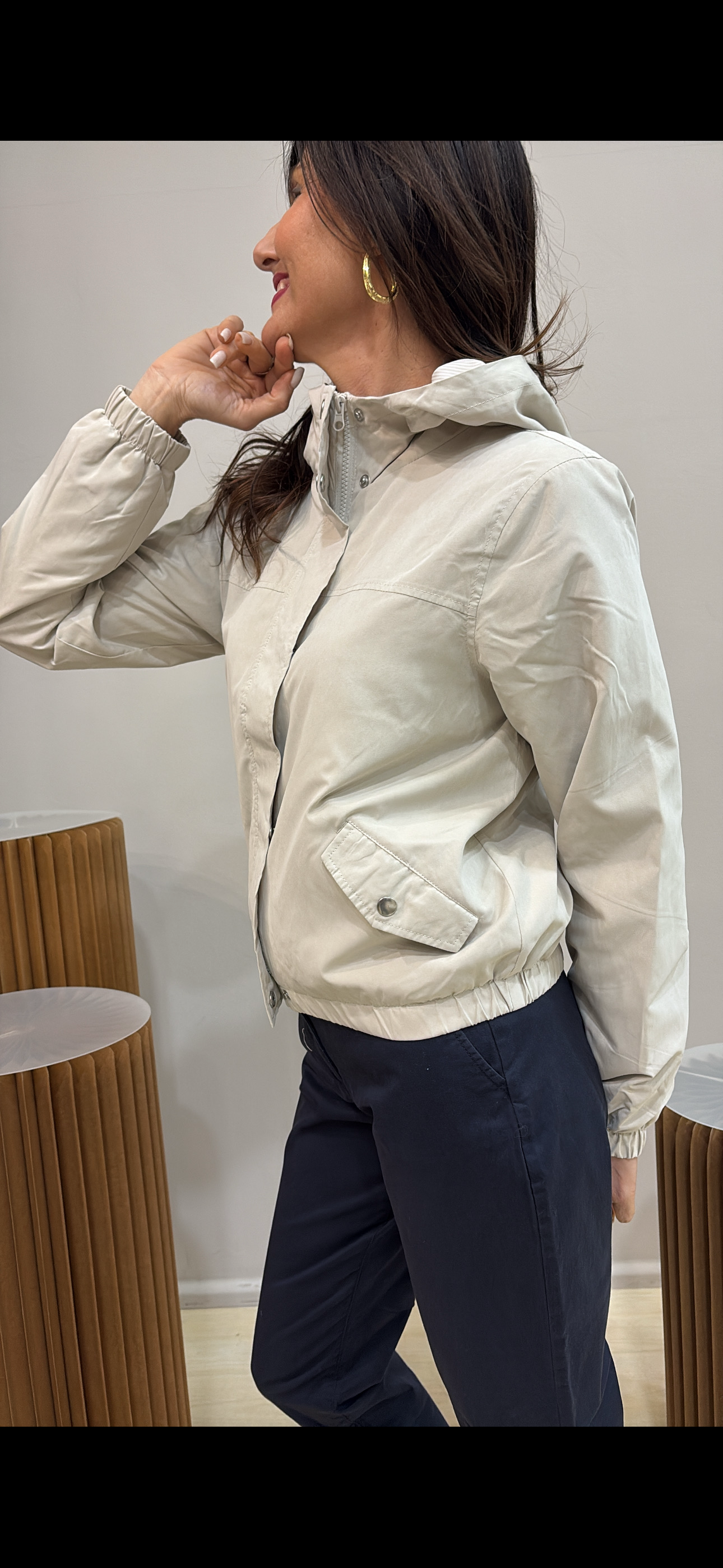 Giubbino con cappuccio e chiusura a zip ricoperta.