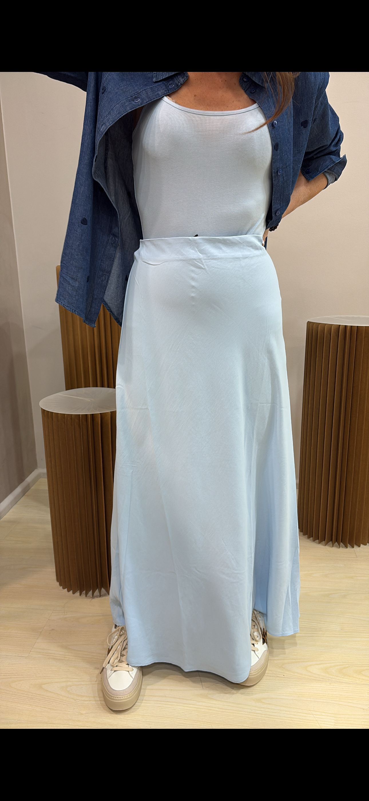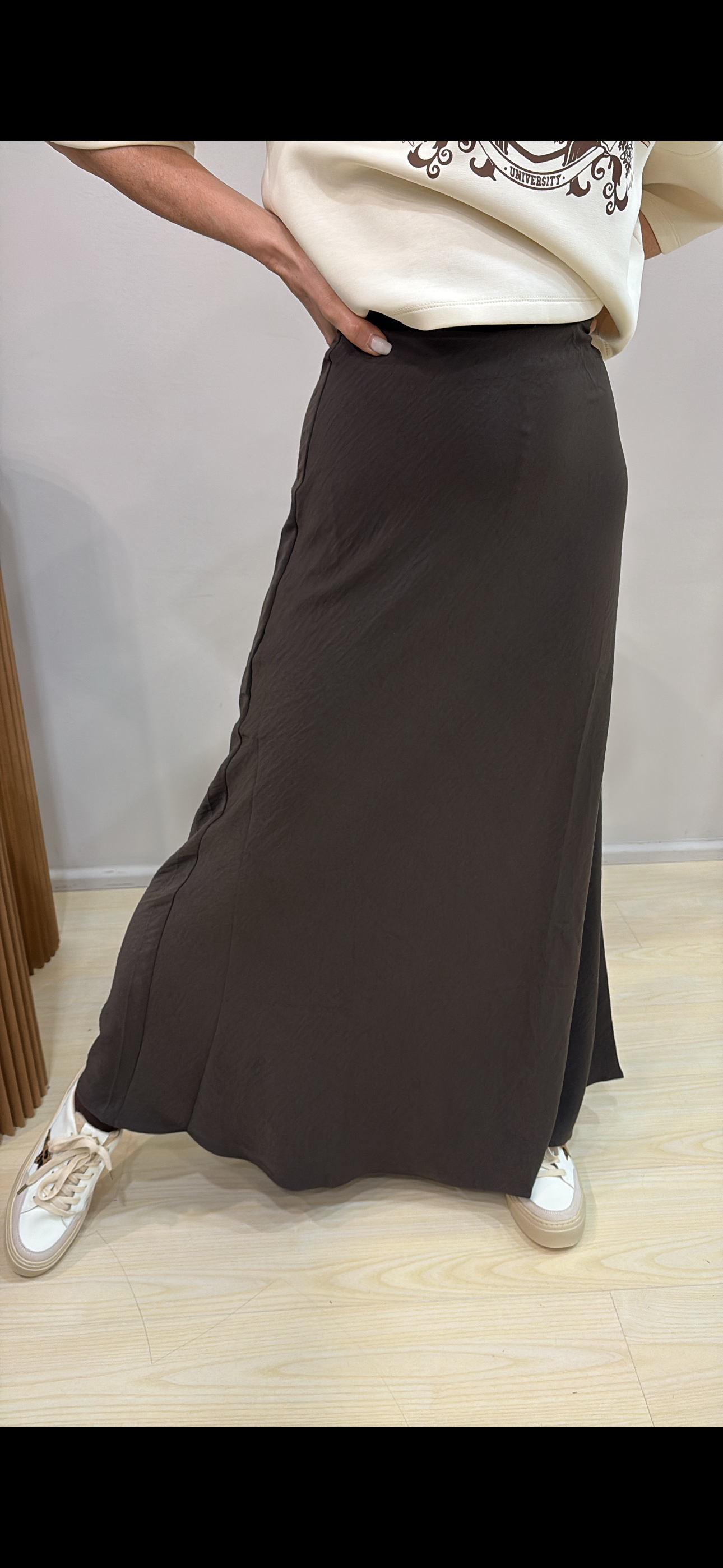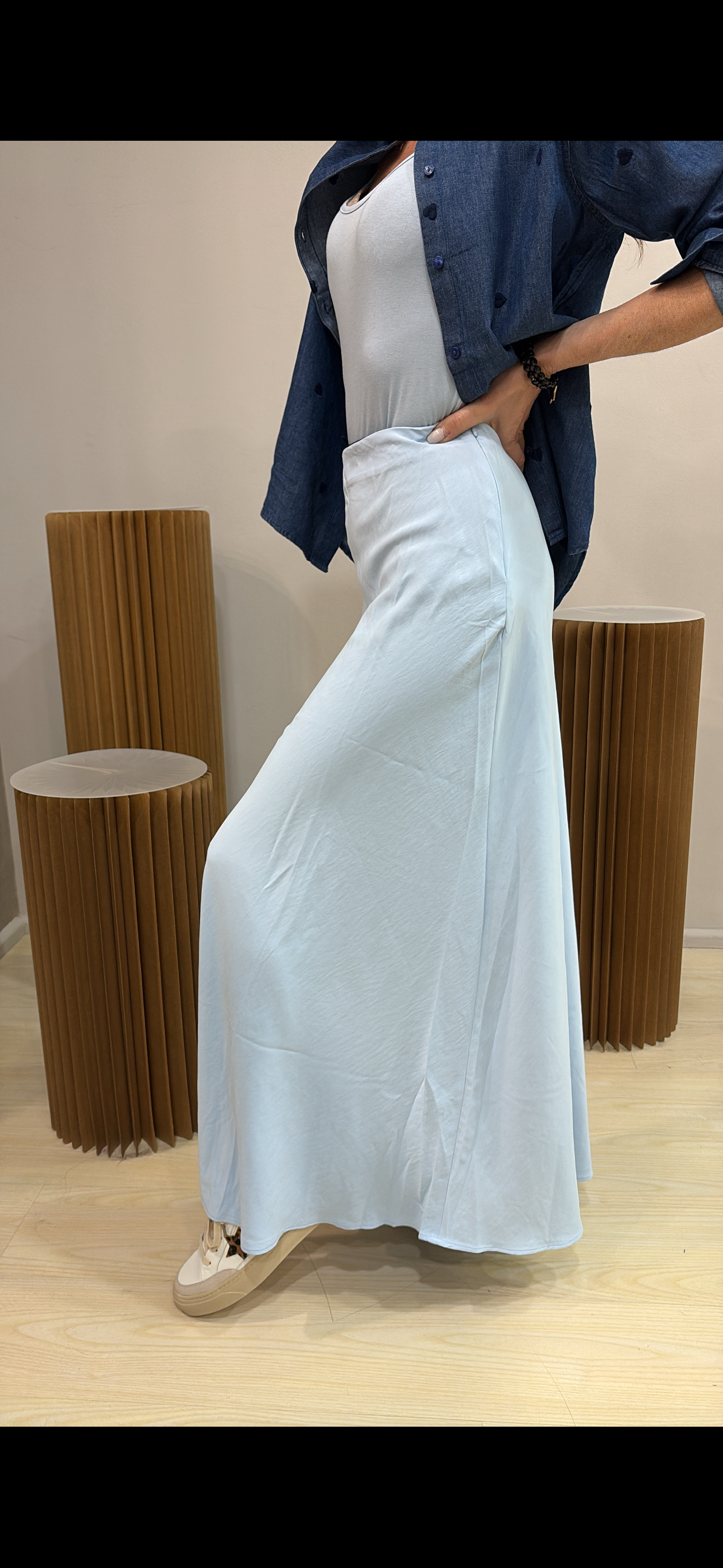 Gonna lunga in satin dal finish luminoso ed elegante, perfetta per valorizzare la silhouette con naturalezza. Il taglio a sbieco dona fluidità e movimento, seguendo delicatamente le linee del corpo.