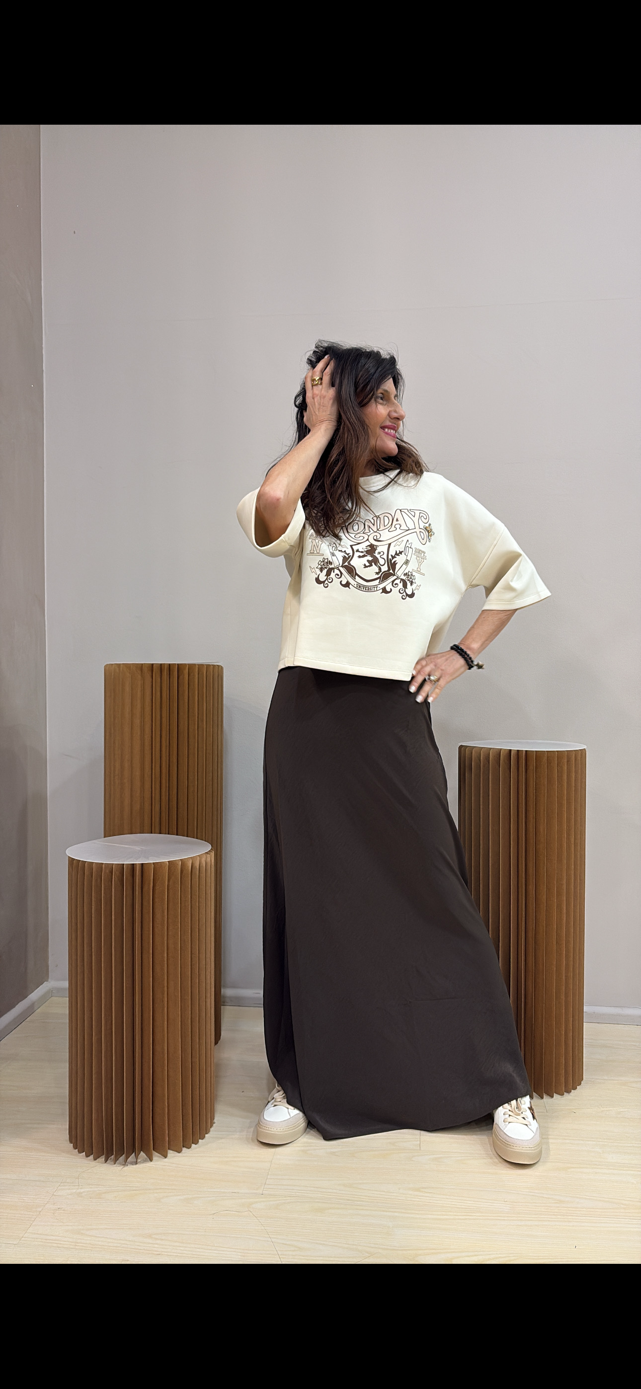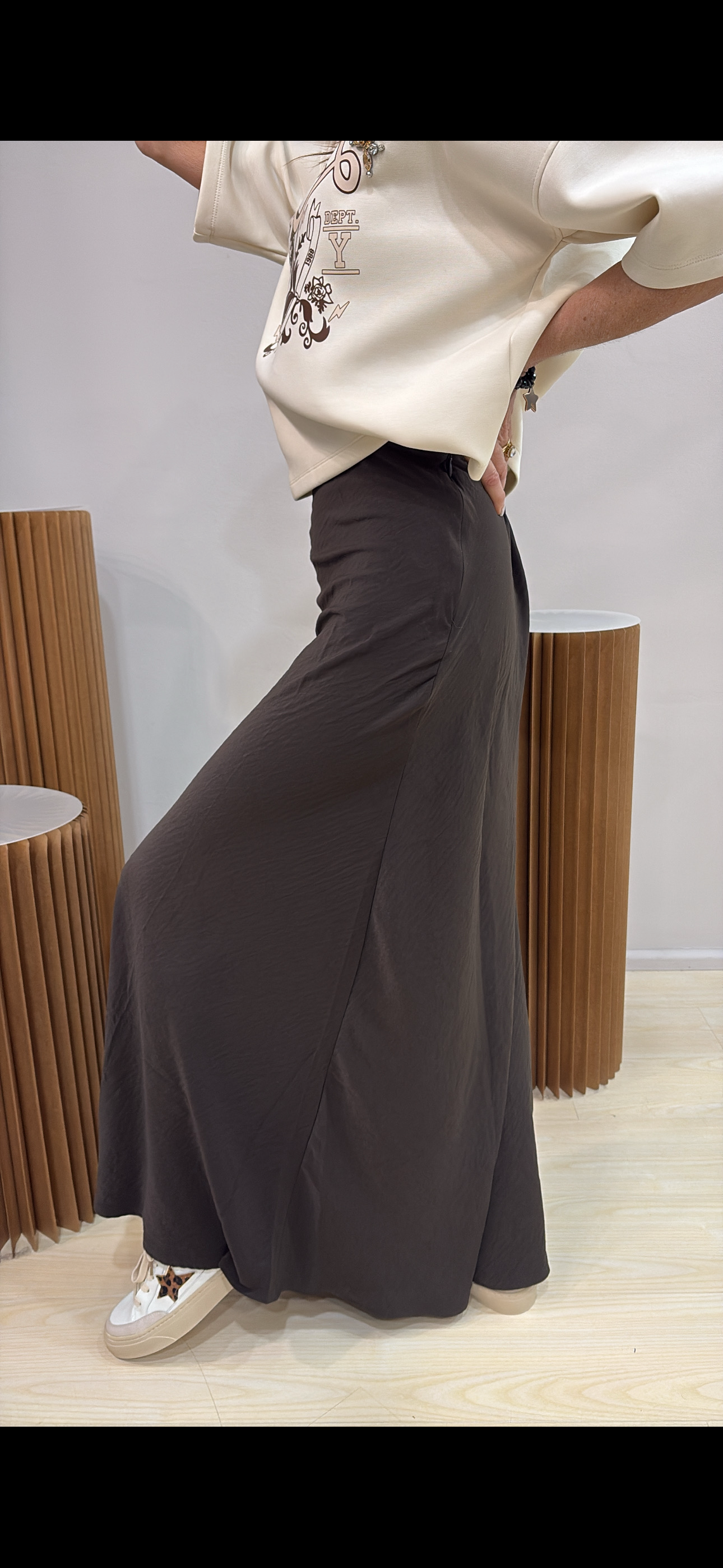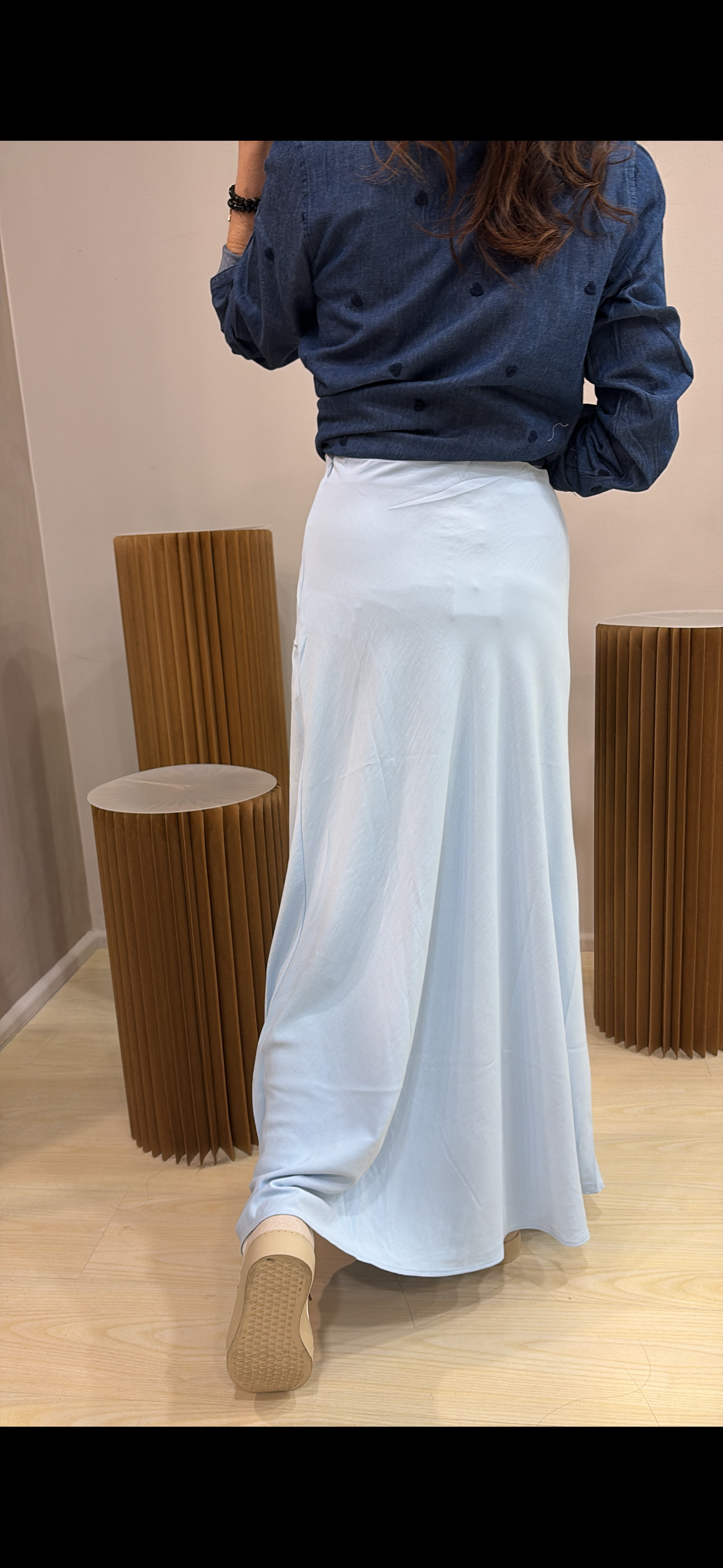 Gonna lunga in satin dal finish luminoso ed elegante, perfetta per valorizzare la silhouette con naturalezza. Il taglio a sbieco dona fluidità e movimento, seguendo delicatamente le linee del corpo.