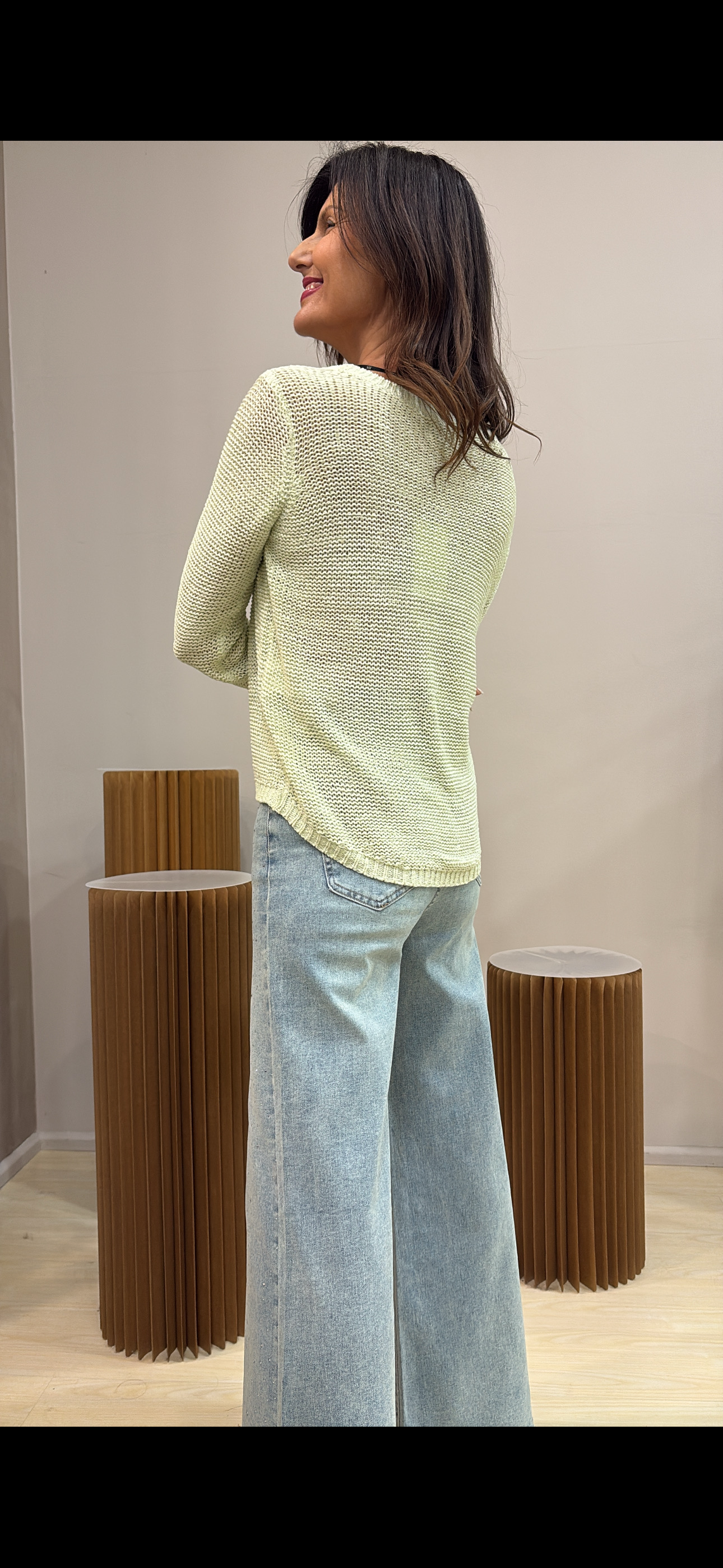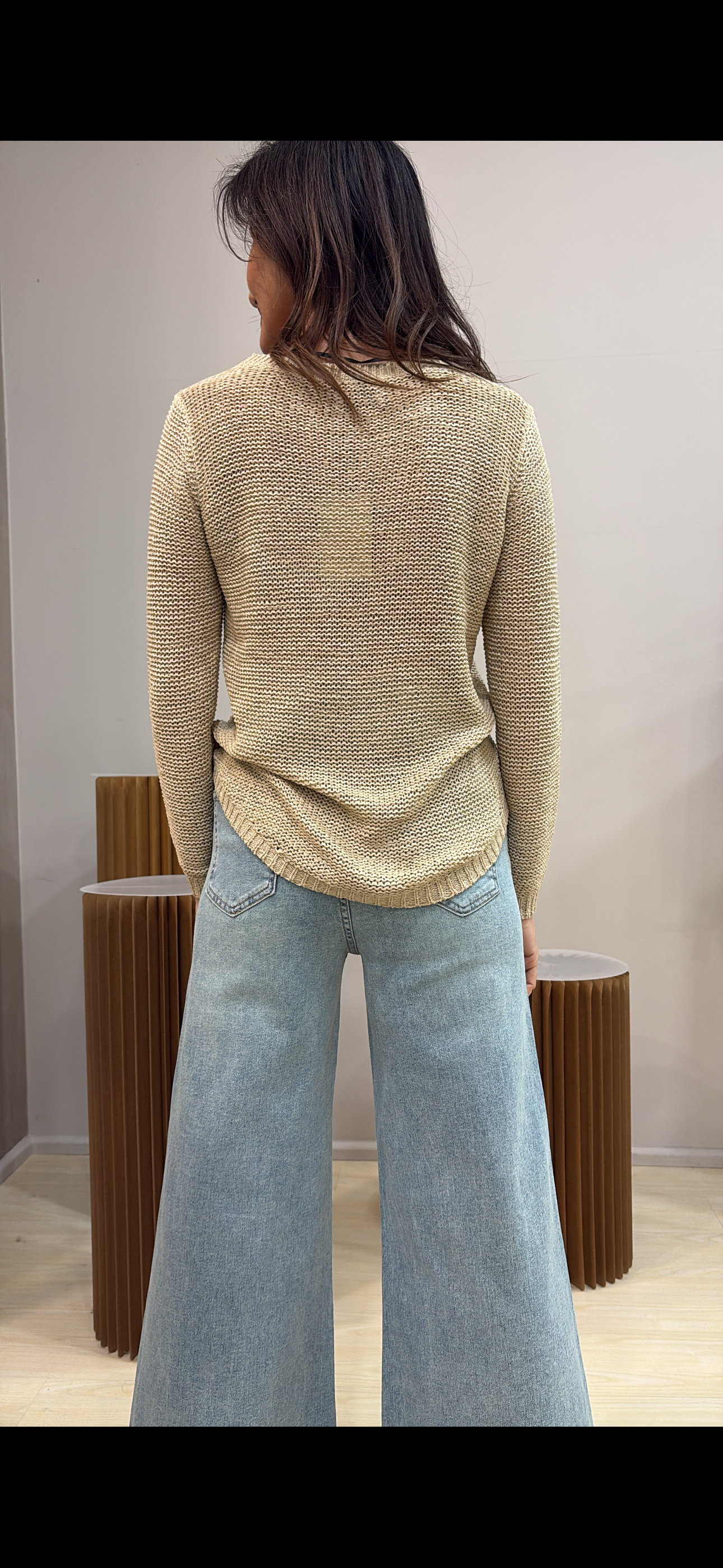 La vestibilità è confortevole, con punto leggermente morbido ma non traforato, per garantire copertura e comfort senza risultare pesante. Il taglio presenta una lunghezza sotto la vita, con parte posteriore leggermente più lunga e fondo stondato, dettaglio che dona movimento e rende il capo moderno e versatile.