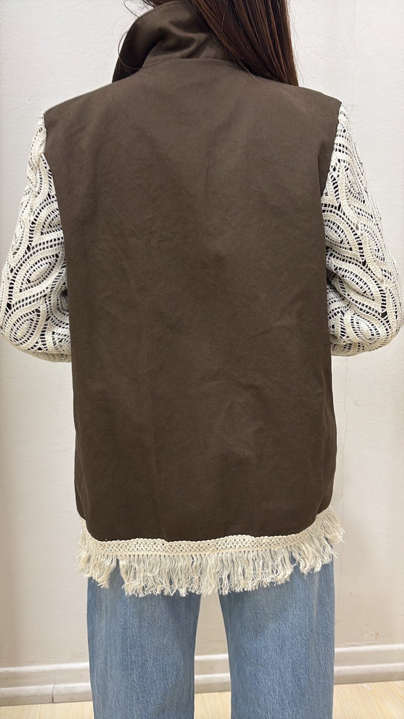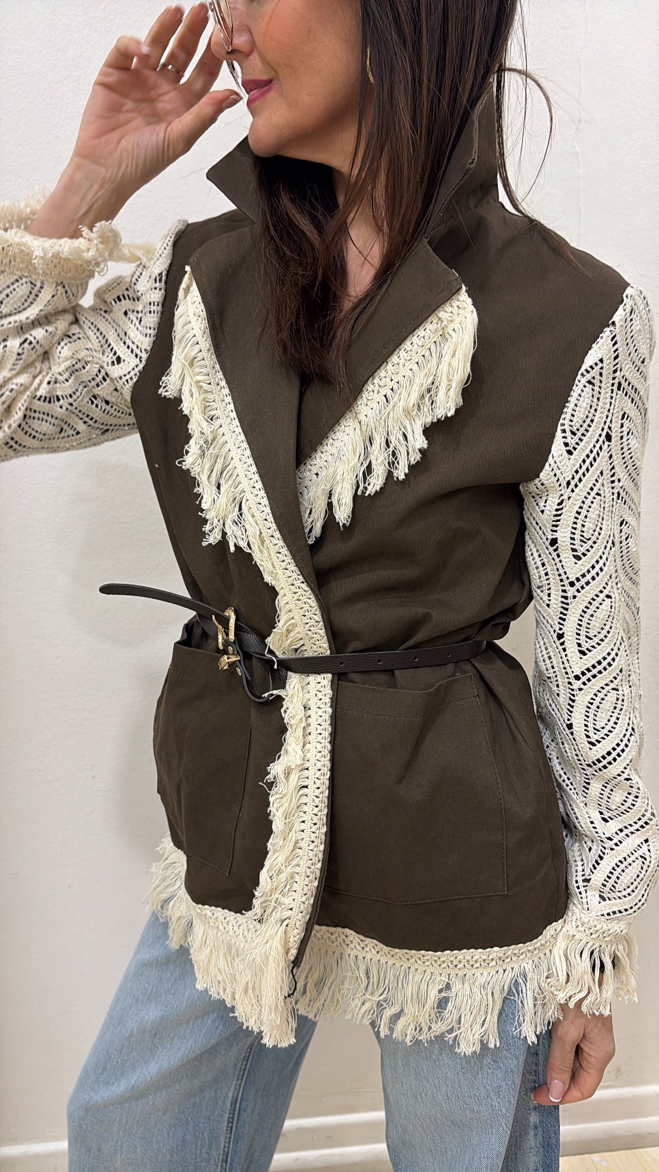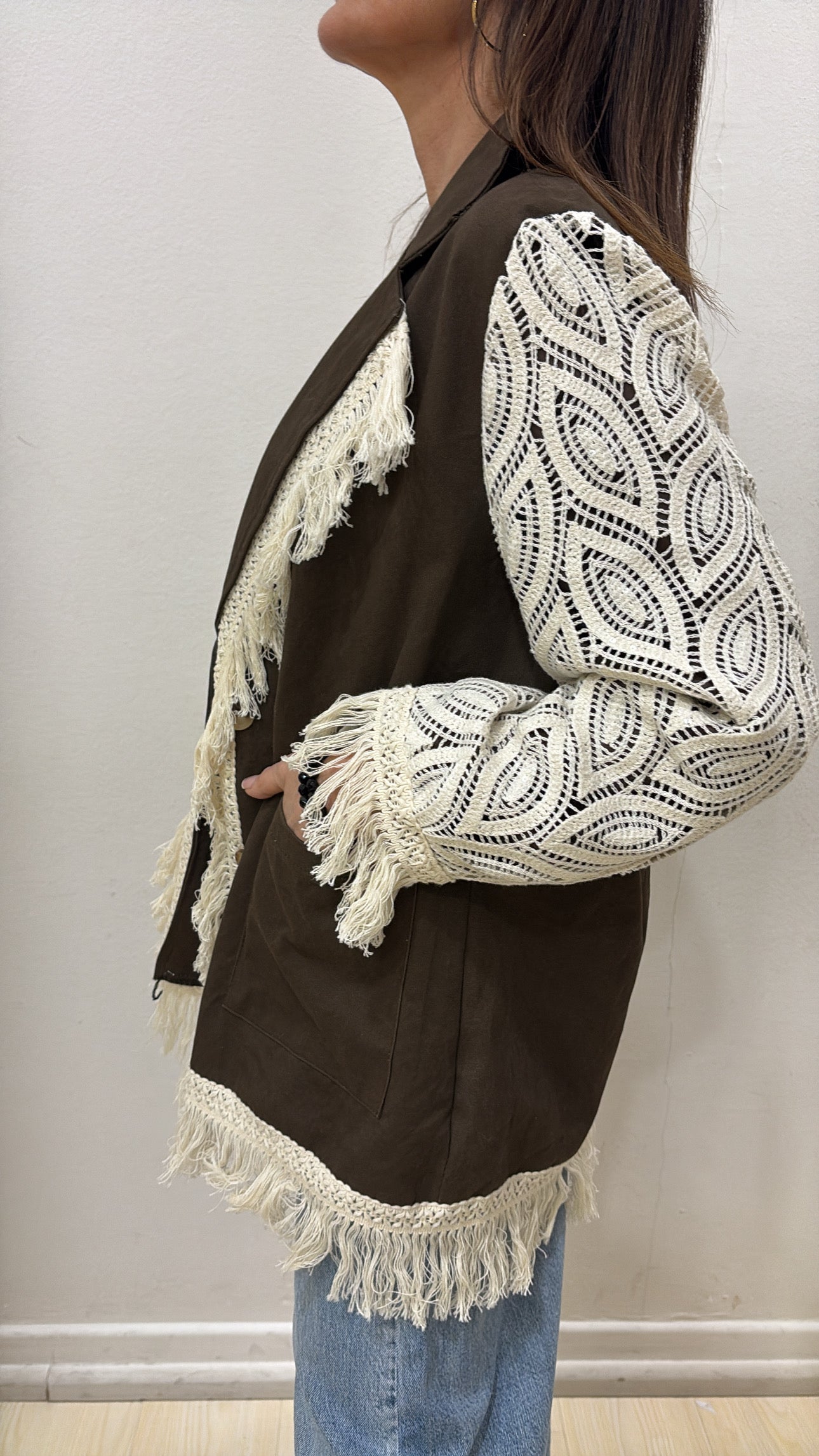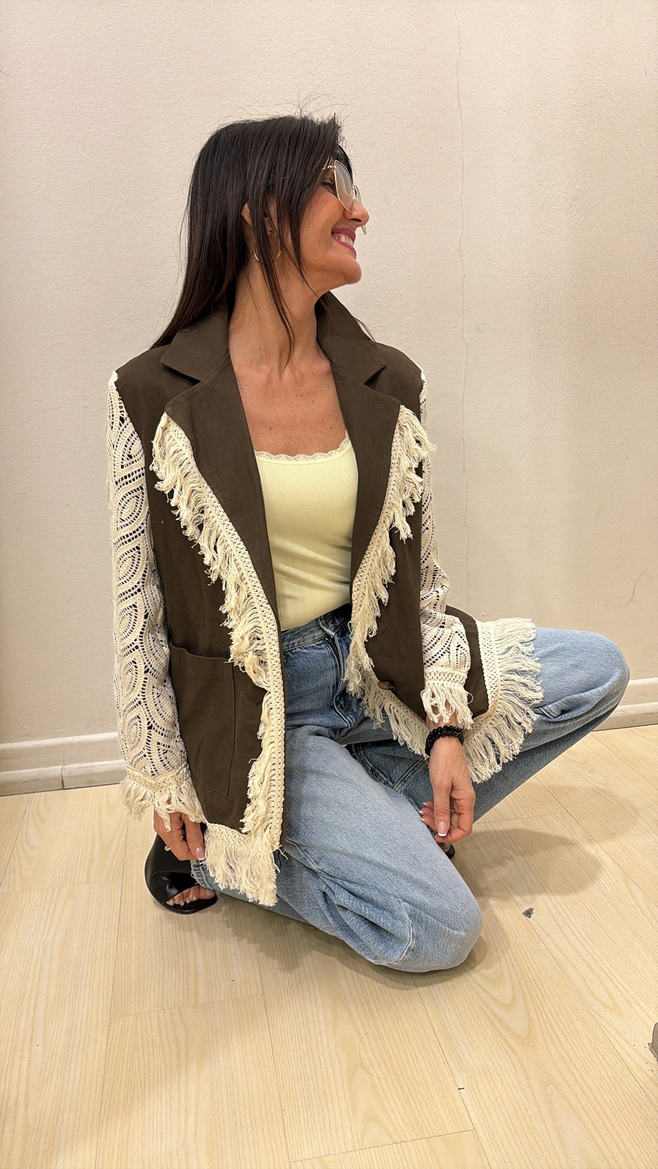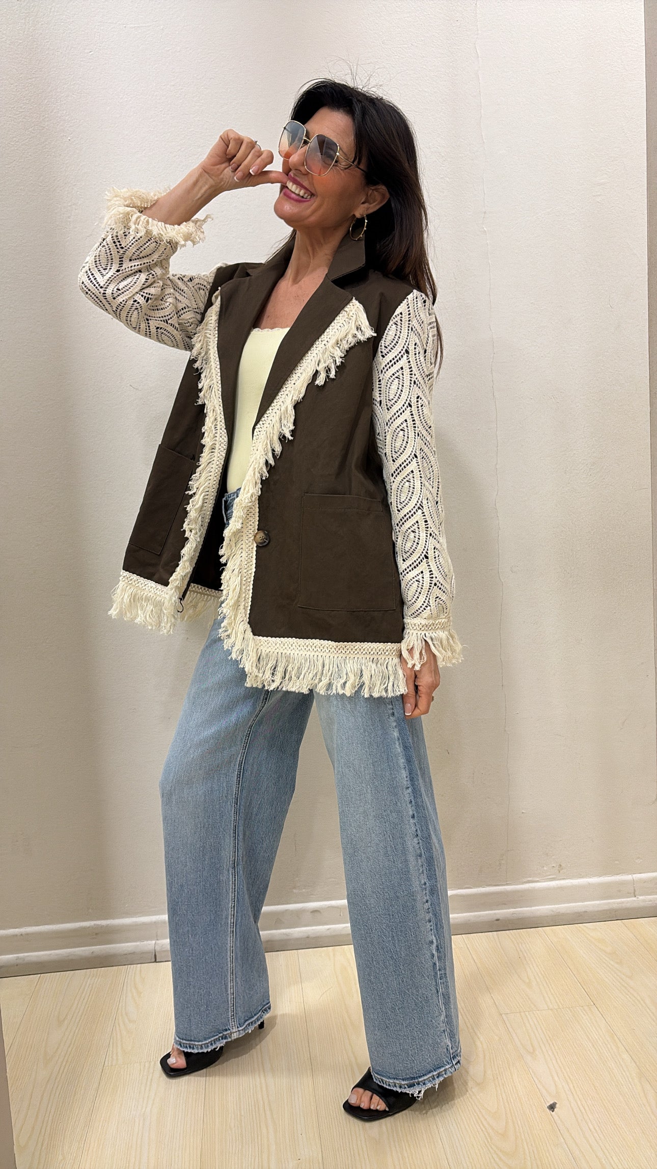 Un elemento distintivo è la passamaneria decorativa con frange, applicata sul fondo manica e lungo tutti i bordi della giacca, a partire dal rever, per un effetto ricercato e femminile.
