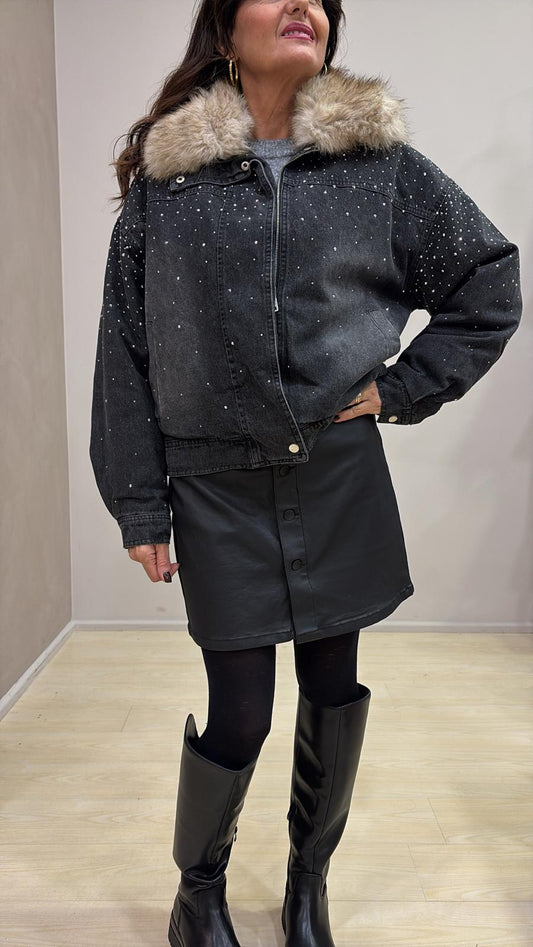 Bomber LILLA Denim – Lusso Oversize con Cristalli e Pelliccia